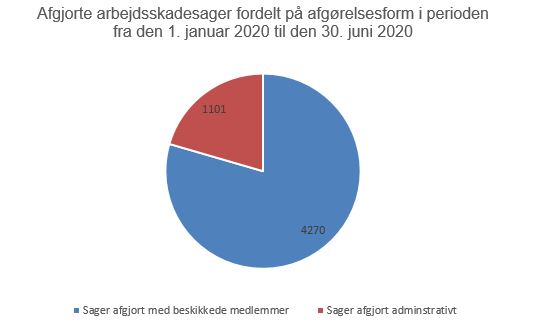Vi har i perioden fra 1. januar 2020 til 30. juni 2020 i alt afgjort 5.371 arbejdsskadesager. Heraf er 4.270 afgjort med deltagelse af beskikkede medlemmer, mens 1.101 sager er afgjort administrativt. Det svarer til 21 % af det samlede antal afgjorte arbejdsskadesager.