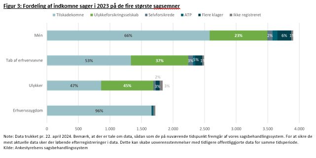 Ankestyrelsen har i 2023 modtaget cirka 11.000 klager i arbejdsskadesager. 78 procent er klager over sager, der udspringer af en arbejdsulykke, imens 22 procent er klager over sager, der udspringer af en erhvervssygdom.