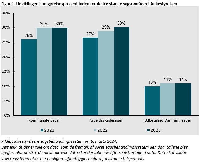Omgørelsesprocenten i 2023 er generelt uforandret inden for Ankestyrelsens tre største sagsområder i forhold til 2022. Omgørelsesprocenten er andelen af sager, som enten er hjemvist, ændret eller ophævet i Ankestyrelsen. Omgørelsesprocenten er steget med ca. 1 procentpoint i arbejdsskadesagerne, mens den er uændret for kommunale social- og beskæftigelsesager samt sager fra Udbetaling Danmark.